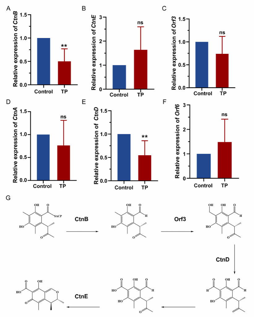 茶多酚可显著抑制桔青霉生长,转录组分析结果显示,茶多酚处理组与对照组之间存在483个下调基因和783个上调基因。其中,orf1和ctnD基因显著下调,表明茶多酚能够影响桔霉素的生物合成。