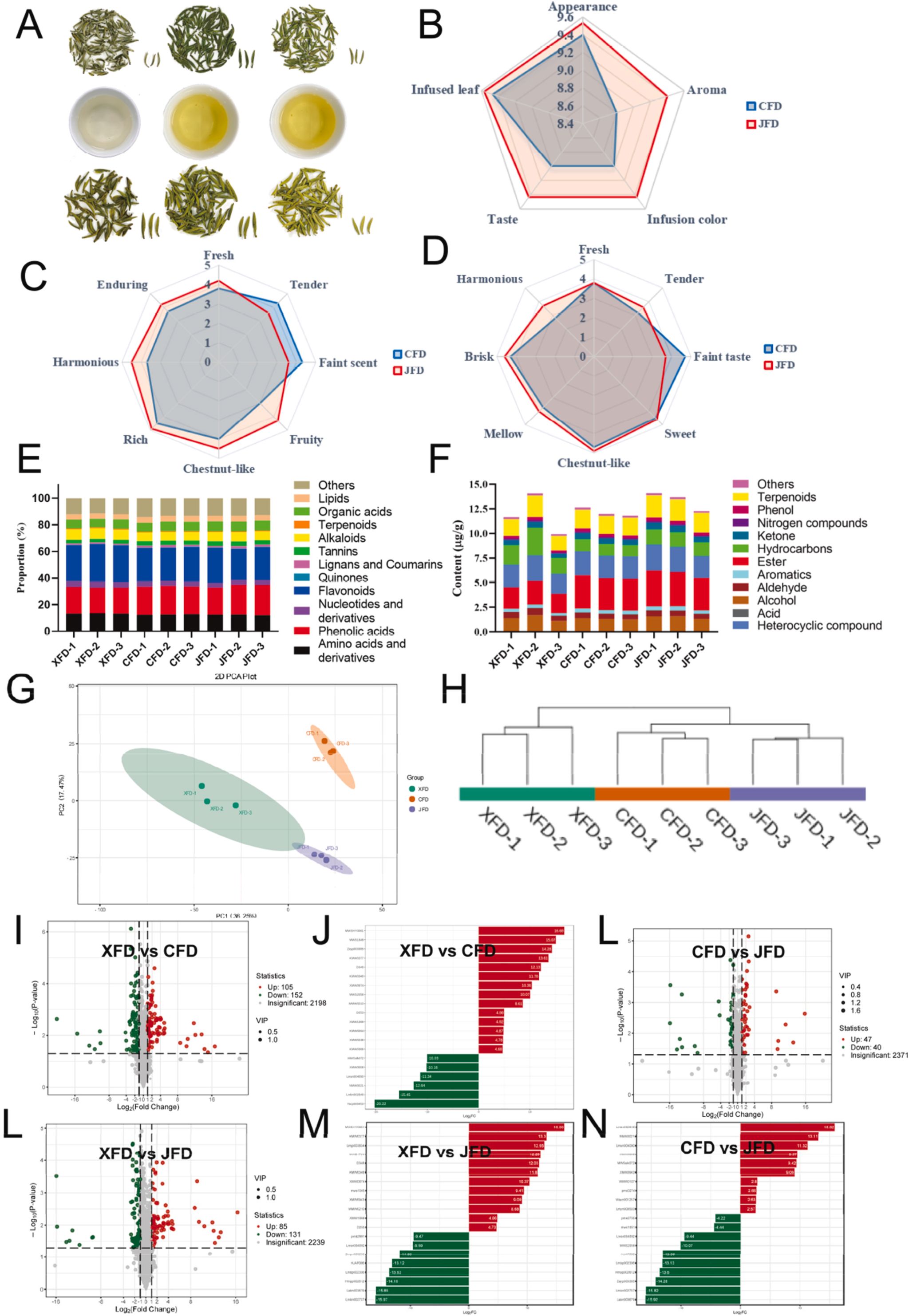 本研究对三种品种——JFD、JF9和JWZ的竹叶青(ZYQ)绿茶及其混合最终产品P的化学成分和品质进行了全面评估。通过UPLC-ESI-MS/MS和GC-MS的非靶向代谢组学方法,鉴定出2459种代谢物,包括1979种非挥发性化合物和480种挥发性化合物。对主要成分谱的分析,结合感官评价、PCA、PLS-DA和HCA,揭示了四种竹叶青茶之间的明显差异,尤其是在非挥发性化合物方面,JFD和P表现出更接近的相似性和更优的品质。总体而言,精制过程通过改善外观、使口感更加醇厚和谐,以及丰富果香和整体香气特征,提升了竹叶青茶的感官品质,尽管它略微降低了嫩香和淡香。鉴定出11种关键挥发物——δ-壬内酯、4-戊烯基乙酸酯、异佛尔酮、2,6-二甲基环己醇、3,5-二甲基十一烷、(Z)-2-甲基-1,5-庚二烯、3-甲氧基肉桂醛、2-吡啶甲胺、四氢-4,6,6-三甲基-2H-吡喃-2-酮、3,6-二甲基-2,3,3a,4,5,7a-六氢苯并呋喃和左旋香芹酮——这些成分对增强香气有重要贡献。尽管代谢组学能够进行广泛的化学分析,但许多化合物的感官相关性仍然不确定。为解决这一问题,我们将靶向定量和感官分析相结合,重点关注具有已知或可能功能作用的代谢物。这些发现为竹叶青绿茶的化学特征提供了深入的理解,竹叶青绿茶是中国最优质的绿茶之一,突出了品种选择、混合和烘焙在优化和稳定茶叶品质中的关键作用。